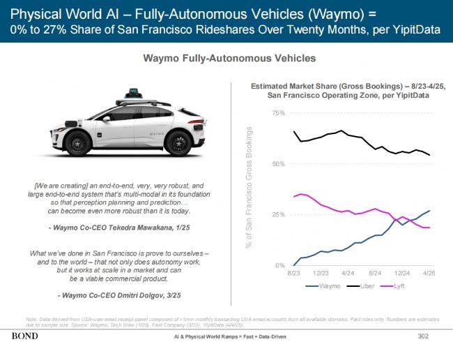 - 自動(dòng)駕駛:Waymo 在舊金山市占率 27%,特斯拉 FSD 累計(jì)里程突破 4 億英里,事故率比人類駕駛低 80%。