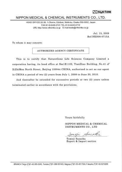 為進(jìn)一步開(kāi)拓中國(guó)市場(chǎng),日本NK公司與我公司達(dá)成合作協(xié)議,香港自然基因生命科學(xué)有限公司成為日本NK公司全線產(chǎn)品中國(guó)區(qū)授權(quán)獨(dú)家總代理。目前,我們的技術(shù)工程師接受了日本NK公司提供的為期7天的售前/售后技術(shù)培訓(xùn),并獲得了廠家頒發(fā)的培訓(xùn)證書(shū)。