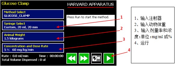 *無需使用電腦即可對動物體重,濃度和劑量率編程--使用者在葡萄糖鉗夾術注射系統(tǒng)中可將要求的濃度,動物體重和劑量率 輸入注射泵,注射泵pump11 elite 可根據(jù)這些信息自動設置注射速率;