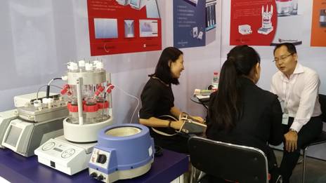 英國Bibby Scientific 集團(tuán),也展示了磁力攪拌器,加熱套, 旋渦混勻器,搖床,PCR,分光光度計,熔點(diǎn)儀,平行反應(yīng)工作站等各類產(chǎn)品。 另外還展示了全球獨(dú)一無二的產(chǎn)品: 來自Electrothermal 子品牌的STEM Intergrity 多管反應(yīng)工作站。在同一系統(tǒng)中同時管理10個不同的反應(yīng),每個反應(yīng)池中,各自獨(dú)立的溫度程序控制和攪拌速度,廣泛用于化學(xué)反應(yīng)篩選等。圖為Bibby 接受專業(yè)媒體“實(shí)驗(yàn)與分析”采訪。