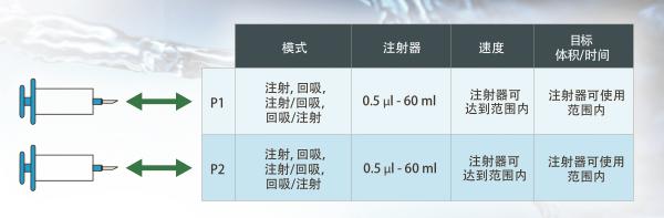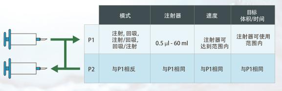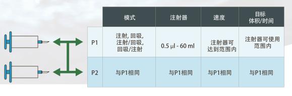 獨立運行方式允許PUMP33 DDS 像兩臺獨立的注射泵一樣運行,系統(tǒng)中以P1和P2來命名,每一臺泵都可以獨立運行,使用不同類型和尺寸的注射器,設(shè)定不同的推力,不同的目標(biāo)(體積或時間)。