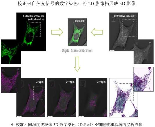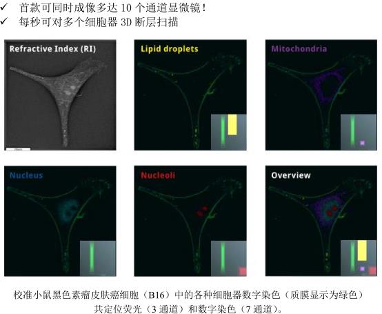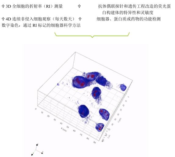 Nanolive 3D Cell Explorer - fluo作為Nanolive公司團(tuán)隊(duì)多年研發(fā)工作的結(jié)晶,其整合全息技術(shù)及旋轉(zhuǎn)斷層掃描技術(shù)、熒光成像系統(tǒng)為一體,使得Nanolive 3D Cell Explorer - fluo成為一個(gè)革新性的技術(shù),可以檢測(cè)光在細(xì)胞中傳遞時(shí)的變化及在細(xì)胞內(nèi)物理折射指數(shù)(RI)的4D分布,全息技術(shù)提供了一種獨(dú)特的在細(xì)胞自然生長(zhǎng)環(huán)境下檢測(cè)細(xì)胞的方法:無(wú)標(biāo)記、非侵入式、免處理、無(wú)干擾性;旋轉(zhuǎn)式掃描,允許3D重構(gòu),噪音去除,遠(yuǎn)超光學(xué)可接受限制的分辨率,優(yōu)化檢測(cè)結(jié)果的獲取,全自動(dòng)校正的光學(xué)技術(shù),保證最好的線性條件——不受環(huán)境影響。使用者可以在實(shí)驗(yàn)結(jié)束后根據(jù)細(xì)胞的不同組分進(jìn)行數(shù)字化染色,通過(guò)無(wú)限的顏色種類(lèi),節(jié)省大量的時(shí)間和試劑經(jīng)費(fèi),在對(duì)細(xì)胞無(wú)損傷的情況下進(jìn)行不斷的染色和再染色。根據(jù)實(shí)驗(yàn)需求可以同時(shí)進(jìn)行熒光標(biāo)記,對(duì)感興趣的分子做定位分析,突破傳統(tǒng)檢測(cè)極限,同時(shí)實(shí)現(xiàn)10個(gè)標(biāo)記的檢測(cè),極大豐富科研數(shù)據(jù)!