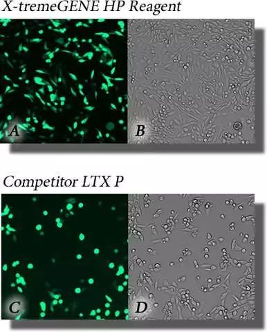 圖 1. 兩種試劑對 CHO-K1 細胞轉染帶 GFP 標記的質粒,A 和 C 是轉染后熒光顯微圖,B 和 D 是明場顯微圖. 與競爭產品比較,X-tremeGENE HP 表現(xiàn)出更優(yōu)的轉染效率更低的細胞毒性