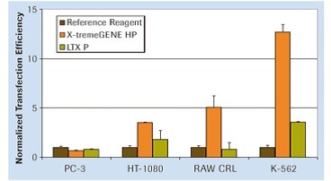 羅氏 X-TremeGENE 便是新一代轉染試劑的佼佼者,升級版的多組分混合試劑,兼具極高轉染效率和極低細胞毒性,在超過 350 株真核細胞株中獲得了高效轉染的驗證,尤其針對難轉染細胞株亦有出色表現(xiàn)。