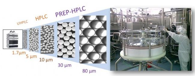 具體來說,色譜“芯”通常是指具有納米孔道結(jié)構(gòu)的微球材料,其粒徑在微米尺度范圍,跟頭發(fā)絲的直徑大小在同一個數(shù)量級,而色譜填料上面的孔徑,則是以納米衡量,大小在5-100納米范圍,是微球直徑的千分之一。由于色譜芯孔道小,因此具有極高比表面(1克色譜芯材料比表面積相當(dāng)于足球場那么大)。為了滿足其選擇性吸附和分離性能要求,微球表面還需要偶聯(lián)一些特殊功能配基,使其具有選擇性吸附和分離目標(biāo)分子功能。用于生物制藥分離純化或?qū)嶒炇曳治鰴z測的色譜芯,制備要求極高,商業(yè)價值大、技術(shù)難度大,需要整合當(dāng)今世界多個前沿領(lǐng)域的交叉技術(shù),涵蓋材料、化學(xué)、物理、和生物多個領(lǐng)域。目前,世界上只有少數(shù)幾家歐美和日本公司具備色譜芯規(guī)模化生產(chǎn)能力,基本壟斷了包括用于分析檢測和生物分離純化的色譜“芯”材料,及其用色譜“芯”組裝成的色譜柱。
