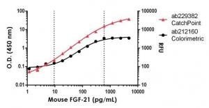Figure 1.Catchpoint 熒光Mouse FGF-21 ELISA 試劑盒 (ab229382)檢測(cè)動(dòng)態(tài)范圍比非熒光法 ELISA試劑盒更廣