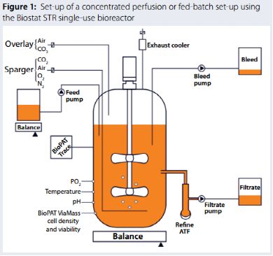 典型的灌注率下降到每天一至兩反應(yīng)器體積的范圍。采用較低的細(xì)胞濾出速度可以建立恒定的細(xì)胞生長(zhǎng)速率,并且可以維持高的存活率,進(jìn)而最大限度避免細(xì)胞截留裝置的堵塞。根據(jù)細(xì)胞截留膜的孔徑大小或截留率,蛋白質(zhì)產(chǎn)物將存在于在無(wú)細(xì)胞上清液(微濾灌注)中或保留在生物反應(yīng)器中(超濾灌注)。由于大多數(shù)抗體是相對(duì)穩(wěn)定的,所以在生物反應(yīng)器中直接灌注的策略,為這種產(chǎn)物的積累提供了一種簡(jiǎn)單而直接的方法,增加給定抗體制造設(shè)施的空間/時(shí)間產(chǎn)量。對(duì)于易降解的重組蛋白,微濾灌注是一種較好的選擇。那些可能表現(xiàn)出反饋抑制作用的產(chǎn)物,應(yīng)盡可能快地從細(xì)胞培養(yǎng)中分離出來(lái),然后在隨后的純化過(guò)程中轉(zhuǎn)移到冷卻的收獲罐中。使用賽多利斯一次性攪拌槽生物反應(yīng)器(聯(lián)合多種尺寸的細(xì)胞截留裝置),可以在2L體積水平進(jìn)行灌注。例如,一個(gè)公司可以使用德國(guó)貝朗或b-dcu控制器,隨后規(guī)模擴(kuò)大過(guò)程至500L,1000L水平時(shí),BIOSTAT STR系統(tǒng)。在1000升和2000-L水平,細(xì)胞截留裝置(例如,Repligen的ATF系統(tǒng)過(guò)濾模塊)通過(guò)一個(gè)使用生物反應(yīng)器包有二合一側(cè)端口。通過(guò)生物反應(yīng)器的外部環(huán)無(wú)菌連接器進(jìn)行操作。
