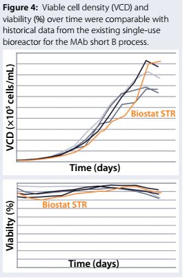 單抗B生產(chǎn):對(duì)BIOSTAT STR進(jìn)行一個(gè)更具挑戰(zhàn)性檢測(cè): 兩種單抗B生產(chǎn)均在過(guò)BIOSTAT STR 2000系統(tǒng)中完成。其中一個(gè)過(guò)程比另外一個(gè)的運(yùn)行時(shí)長(zhǎng)多25%。對(duì)于較短的過(guò)程,VCD和百分之活率與現(xiàn)有的一次性使用生物反應(yīng)器的歷史數(shù)據(jù)相比較(圖4)。