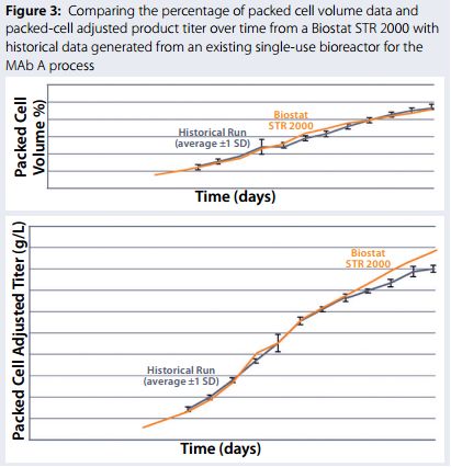 單克隆抗體-生物反應(yīng)器的功能等價(jià)性的標(biāo)桿:圖2顯示的是可行Biostat STR 2000 system的細(xì)胞密度(VCD)和細(xì)胞存活率(%)與現(xiàn)有的一次性生物反應(yīng)器的歷史數(shù)據(jù)比較。前者的平均數(shù)據(jù)屬于這些歷史數(shù)據(jù)產(chǎn)生的平均值正負(fù)一個(gè)標(biāo)準(zhǔn)差范圍內(nèi)。