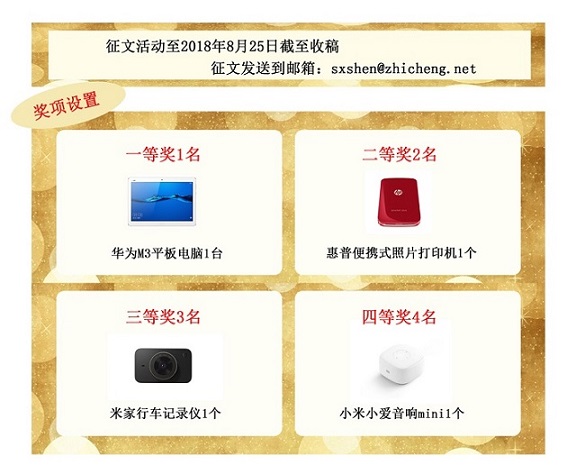 請將您聯(lián)系方式及征文發(fā)送到sxshen@zhicheng.net,入選后工作人員會直接聯(lián)系您發(fā)放禮品。