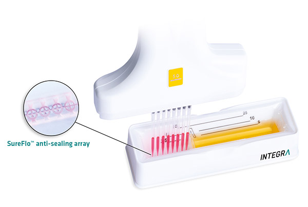 每個(gè)儲(chǔ)液槽都帶有INTEGRA的SureFlo™防封閉陣列,該陣列可防止槍頭封閉從而避免液體“沖入”過(guò)濾器或移液器。這種特性通過(guò)特殊配方水表面處理得以增強(qiáng),可以阻止液體聚集,造就了市面上同類產(chǎn)品中最低的死體積。新設(shè)計(jì)完美地補(bǔ)充了INTEGRA多通道EVOLVE手動(dòng)移液器、VIAFLO電動(dòng)移液器以及VOYAGER可調(diào)間距移液器的全系列產(chǎn)品。8通道VOYAGER移液器非常適合從5 ml側(cè)吸取,再分配至96或384孔板中,在使用昂貴的試劑(如PCR預(yù)混液)時(shí)具有顯著的優(yōu)勢(shì)。