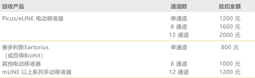 即日起至2018年9月30日,凡購買Picus系列電動移液器(包含Picus 和Picus NxT)時提供以下列表中的產(chǎn)品作為抵扣,即可參與以舊換新優(yōu)惠購活動。具體抵扣價格如下: