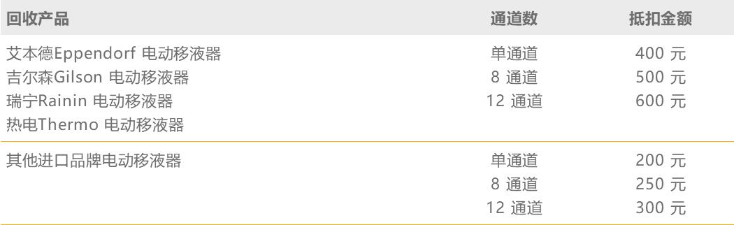 回收的移液器與新選購的移液器需通道數(shù)一致,方可抵扣。抵扣金額參考上表。 |