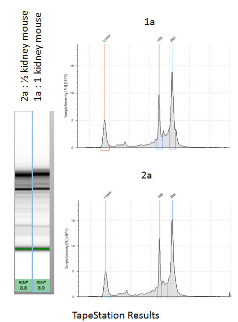 SelectScience在該篇社論中指出,科學(xué)家們非常關(guān)注二代測序的最新技術(shù)和應(yīng)用,并探索著從小鼠全腎和部分腎中制備高質(zhì)量的總RNA樣品用于基因表達(dá)分析,因?yàn)橹挥袕恼麄(gè)器官中提取總RNA,才能可靠地估計(jì)器官中的基因表達(dá)水平(因?yàn)檩^小的部分組織部分可能不代表整個(gè)器官)。該報(bào)道特別介紹了法國Bertin Precellys生物樣本研磨器幫助科學(xué)家有效地從腎器官中提取總RNA,從而獲得高質(zhì)量和高完整性的RNA,為RNA測序和基因表達(dá)分析做好充分準(zhǔn)備。建立了RNA提取的理想方案,并證明Precellys從半個(gè)或整個(gè)小鼠腎臟中提取RNA非常有效,如下圖所示分析了兩種樣本研磨提取后RNA質(zhì)量和完整性,圖中結(jié)果顯示兩種樣本都獲得了非常高質(zhì)量 (RIN>8.8)的RNA。