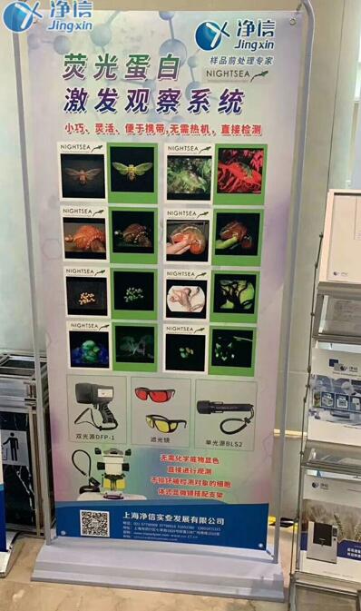 同時,在此次展會上,上海凈信還推出了一款沉淀已久的新產(chǎn)品—美國NightSea熒光蛋白激發(fā)觀察系統(tǒng),這是一款無需化學(xué)底物顯色,直接進行觀測,不損壞被檢測對象細胞的設(shè)備,擁有小巧、靈活、易攜帶、使用簡便等優(yōu)點,對于有轉(zhuǎn)基因?qū)嶒炐枨蟮目蒲腥藛T,是一種特別“對胃口”的產(chǎn)品;其原理是發(fā)出的特種光源照射至生物表面時,佩戴專用濾光鏡(過濾掉大部分反射光只保留所需要的光源);便可實時觀察生物的基因變化狀態(tài),目前分為單光源和雙光源兩種型號。