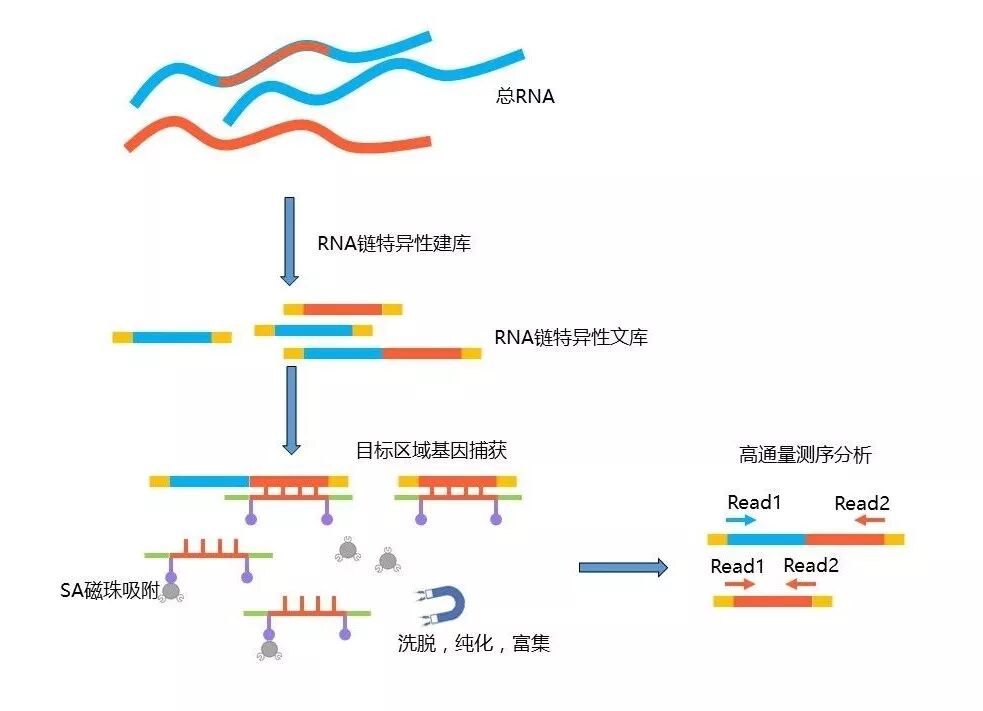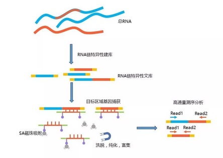 本產(chǎn)品依托艾吉泰康自主研發(fā)的TargetSeq One™液相雜交捕獲技術(shù)。利用自有人工智能算法設(shè)計(jì)探針序列,經(jīng)過高通量合成制備出相應(yīng)的RNA探針。提取的總RNA樣本經(jīng)過鏈特異性文庫構(gòu)建后,通過與特異性探針進(jìn)行雜交,特異性富集病毒序列,然后上機(jī)測(cè)序、分析。具體技術(shù)流程見下圖。