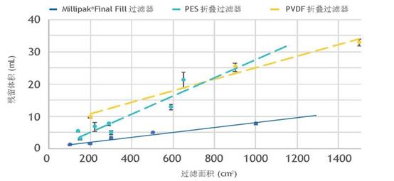 ® Final Fill過(guò)濾器的低殘留體積,意味著與傳統(tǒng)的折疊過(guò)濾器相比,它能夠有效提高最終產(chǎn)出。Millipak