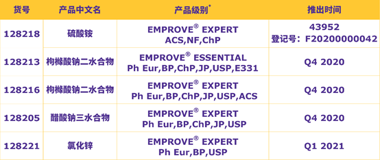 正如默克向全球客戶承諾,所有在中國南通生命科學中心生產的藥用輔料都會在中國申請登記備案,支持客戶關聯(lián)審批。2020年預計還有128213,128216 枸櫞酸鈉可完成登記備案工作。