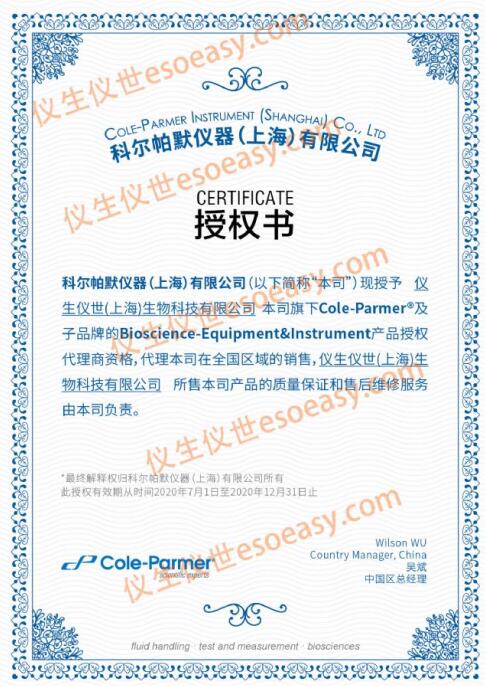 儀生儀世獲得科爾帕默MASTERFLEX蠕動(dòng)泵授權(quán)總代理商,MASTERFLEX蠕動(dòng)泵屬于Cole-Parmer其下的流體產(chǎn)品線,目前科爾帕默正式將次產(chǎn)品線授予給儀生儀世代理,授權(quán)書(shū)如下: