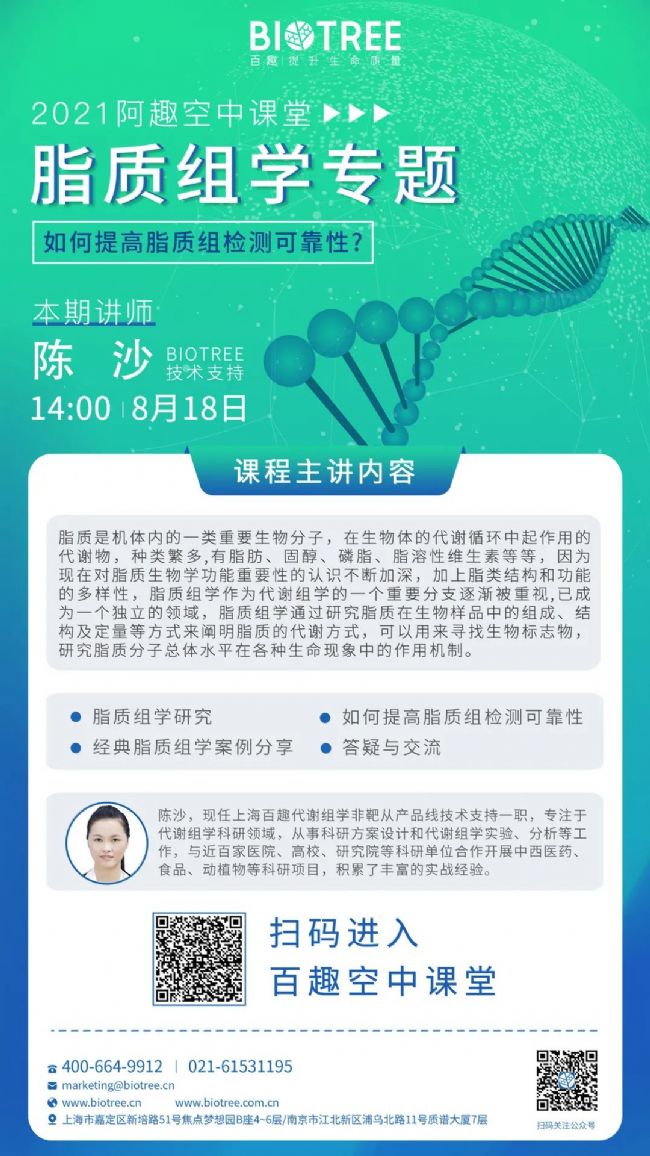 2021年6月9日,阿趣空中課堂推出了一期《脂質(zhì)組學(xué)專題——全新角度探索生命奧秘》,獲得了各位科研小伙伴們的一致好評,阿趣特多加更一期《脂質(zhì)組學(xué)專題——如何提高脂質(zhì)組檢測可靠性?》,歡迎各位有興趣的小伙伴在8月18日鎖定阿趣空中課堂直播,歡迎大家?guī)е鴨栴},進(jìn)入直播間,和老師一起交流。