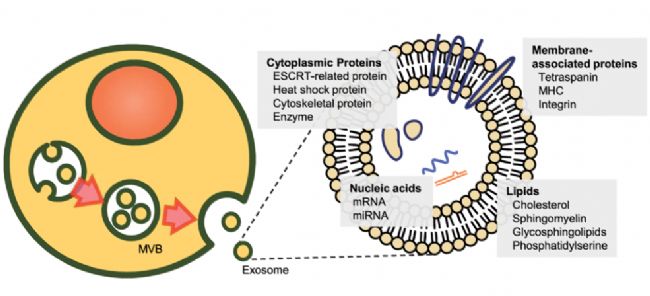 幾乎所有的細(xì)胞都分泌細(xì)胞外小泡,包括外泌體、微泡和凋亡小體。其中外泌體直徑為30-120nm,是最小的細(xì)胞外小泡,由含有外泌體的多囊體(MVB)與質(zhì)膜融合分泌的,可通過細(xì)胞內(nèi)吞泡膜向內(nèi)凹陷形成多泡內(nèi)涵體,內(nèi)涵體與細(xì)胞膜融合后釋放其中的小囊泡。這一過程由一種被稱為轉(zhuǎn)運(yùn)所需的內(nèi)體分選復(fù)合體(ESCRT)的蛋白質(zhì)機(jī)制調(diào)節(jié)。包括脂質(zhì)、蛋白質(zhì)和核酸在內(nèi)的幾種分子被分選到外泌體。核糖核酸結(jié)合蛋白和蛋白質(zhì)的修飾如泛素化、糖基化都與這些過程有關(guān)。