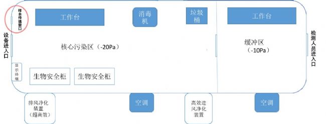 檢測人員身穿三級防護,從檢測入口進入,通過緩沖區(qū)和核心污染區(qū)的隔離門進入污染區(qū),樣本從樣本傳遞窗傳遞進入核心污染區(qū),在核心污染區(qū)內(nèi)的生物安全柜里打開樣本管進行操作。操作結束后,返回緩沖區(qū),按SOP脫去防護服后從緩沖區(qū)走出移動方艙實驗室。以上操作可以有效的避免人員與陽性樣本的交叉污染,避免操作人員接觸到病毒,確保人員安全。