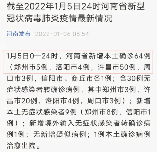 2022年1月5日0到24時,河南省新增本土確診64例,波及省內(nèi)6市,其中許昌50例。針對多地疫情散發(fā),河南省迅速行動,多地收緊疫情防控政策,啟動了大規(guī)模核酸檢測。