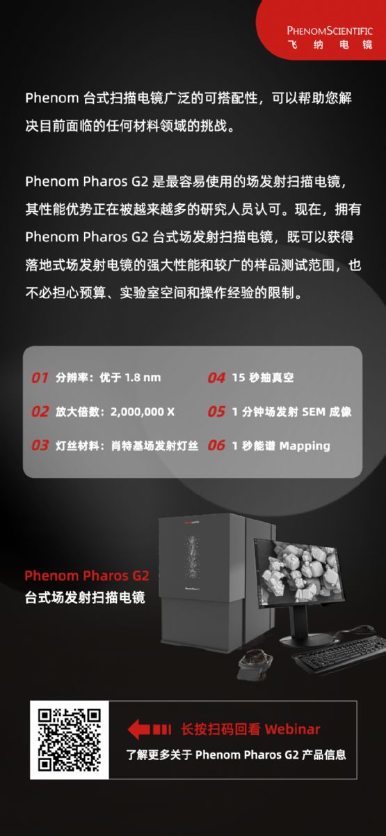 Phenom Pharos G2 臺(tái)式場(chǎng)發(fā)射掃描電鏡作為一款高效且易于使用的桌面式掃描電鏡,為各種材料提供高分辨率成像,也可以對(duì)各類電子束敏感樣品進(jìn)行成像,將研究領(lǐng)域擴(kuò)大到藥物、聚合物和有機(jī)材料等。