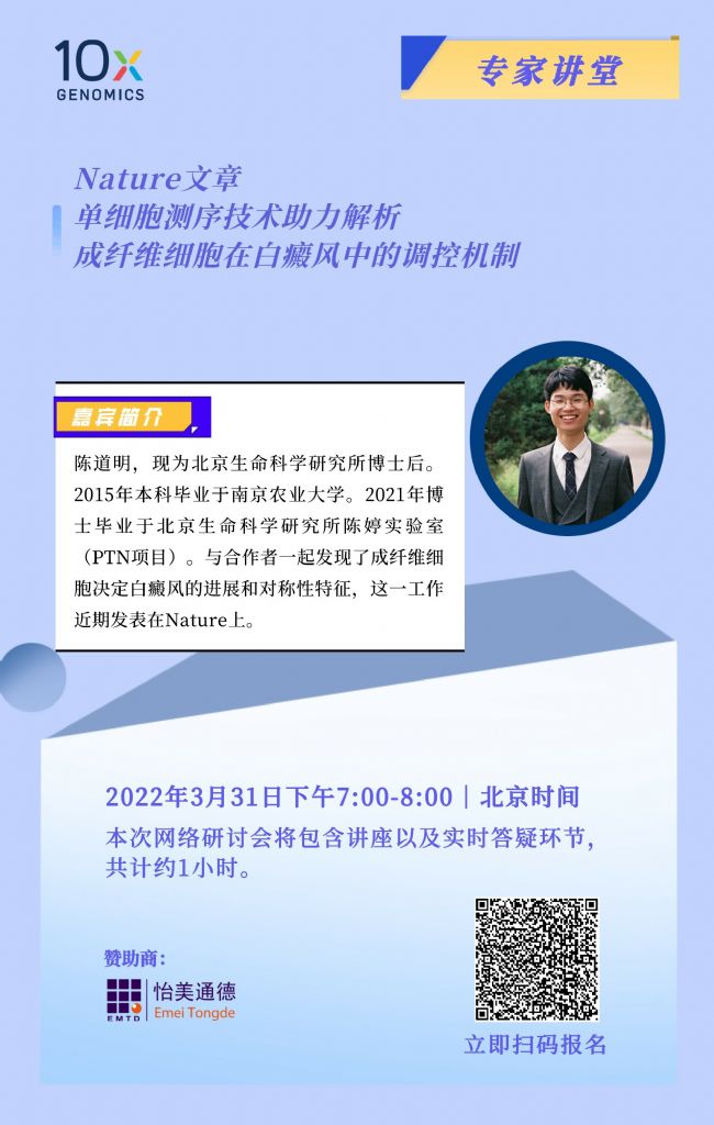 歡迎注冊參加由10x Genomics和怡美通德聯(lián)合舉辦的專家講堂:單細胞測序技術助力解析成纖維細胞在白癜風中的調控機制。本次網(wǎng)絡研討會我們榮幸地邀請到北京生命科學研究所博士后陳道明老師,陳道明老師是該Nature論文的共同第一作者。