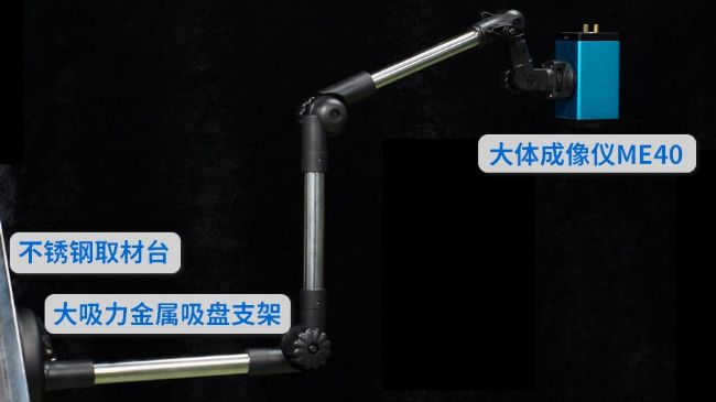 除了標(biāo)準(zhǔn)的底座式安裝,大體成像儀ME40還可以選配大吸力金屬吸盤(pán)支架,可以非常靈活而牢固地吸附在取材臺(tái)的不銹鋼面上,節(jié)省臺(tái)面的處理空間,也減少設(shè)備清潔的麻煩。