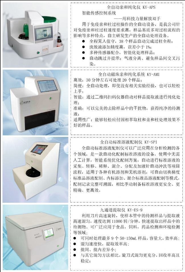自主研發(fā)儀器設備包括:全自動親和純化儀、全自動磁珠親和純化儀、九通道提取儀、全自動標準溶液配制儀、光化學衍生器、泵流操作架等。