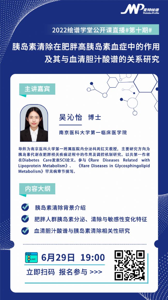 6月29日 19:00,繪譜學(xué)堂特邀《Diabetes Care》雜志上發(fā)表題為 Impaired Insulin Clearance as the Initial Regulator of Obesity Associated Hyperinsulinemia: Novel Insight Into the Underlying Mechanism Based on Serum Bile Acid Profiles (點(diǎn)擊標(biāo)題查看原文詳讀)的第一作者「南京醫(yī)科大學(xué)第一臨床醫(yī)學(xué)院的吳沁怡博士」,為大家?guī)黻P(guān)于《胰島素清除在肥胖高胰島素血癥中的作用及其與血清膽汁酸譜的關(guān)系研究》的專題講座。報(bào)告結(jié)束后特設(shè)現(xiàn)場答疑環(huán)節(jié),主講嘉賓將零距離與您溝通交流,歡迎各位老師報(bào)名聽課!
