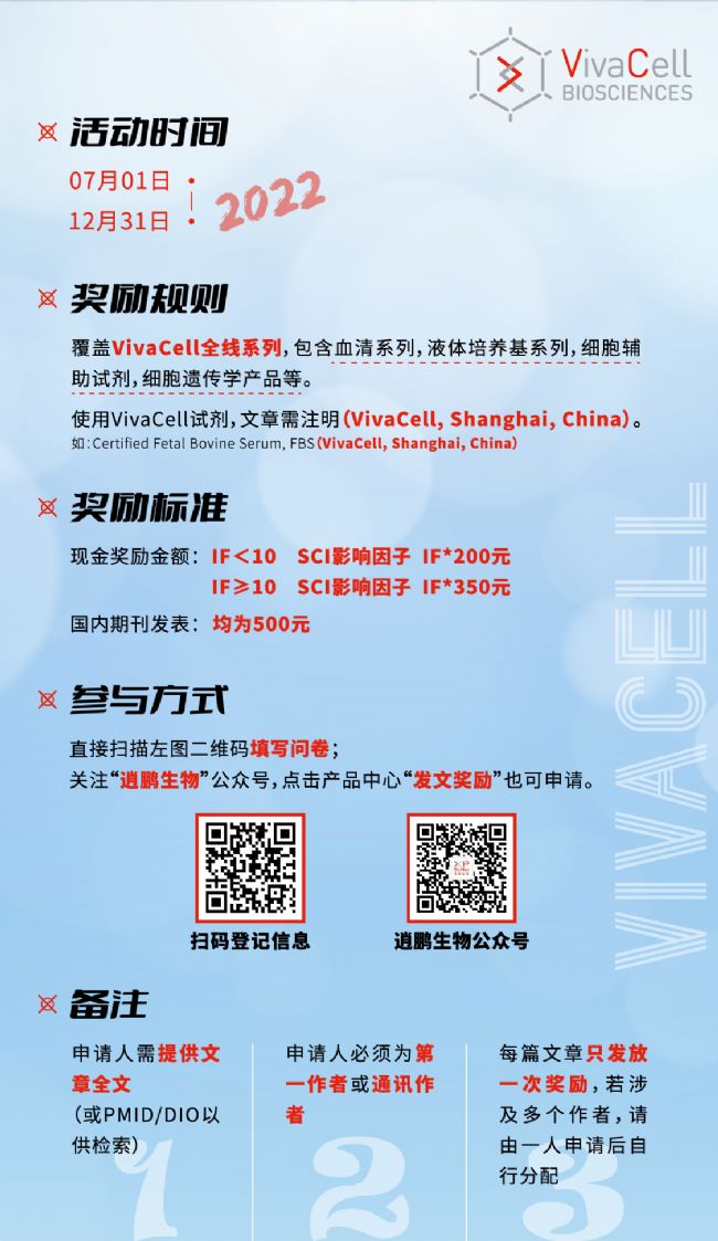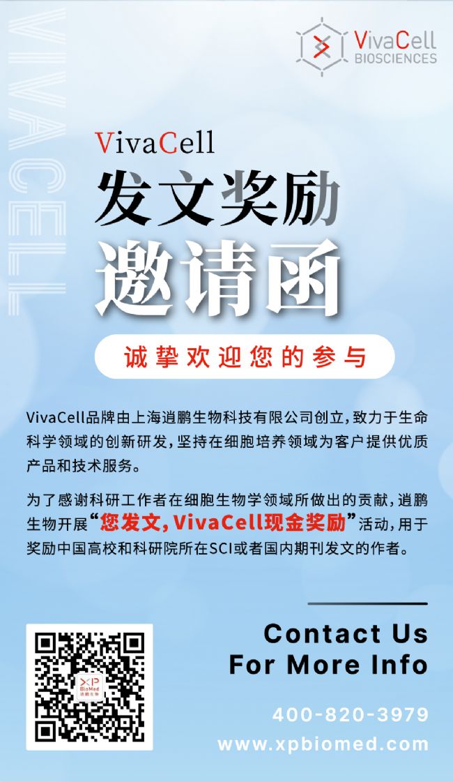 為了感謝科研工作者在細(xì)胞生物學(xué)領(lǐng)域所做出的貢獻(xiàn),逍鵬生物開展“您發(fā)文,VivaCell現(xiàn)金獎勵”活動,用于獎勵中國高校和科研院所在SCI或者國內(nèi)期刊發(fā)文的作者。