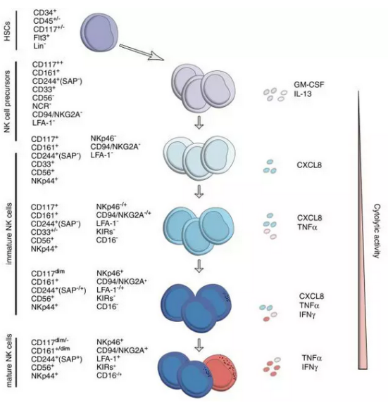NK細胞(自然殺傷細胞)是固有免疫的主力軍,體外NK細胞的分化過程可以通過流式細胞儀進行檢測。NK細胞起源于CD34+造血干細胞(CD34+HSCs),其分化主要經(jīng)歷三個階段:NK前體細胞(NKP),未成熟的NK細胞(iNK)和成熟NK細胞(mNK)。CD161的首次出現(xiàn)意味著細胞進入NKP階段;隨著活化受體NKp44的表達,iNK逐漸形成;最后,CD16和殺傷細胞免疫球蛋白樣受體(KIR)的表達標(biāo)志著NK細胞進入成熟階段。這也就說明,CD16對于NK細胞的成熟起著決定性的作用。