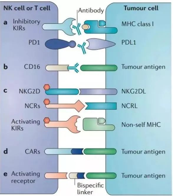 此外,設(shè)計以NK細胞表面活化受體CD16和NKG2D為靶點的雙特異性分子,可以靶向NK細胞識別并殺傷腫瘤細胞。(雙特異性分子被設(shè)計用來識別激活NK細胞受體結(jié)合另一端的腫瘤抗原,以使NK細胞殺滅過度表達這些抗原的腫瘤細胞)