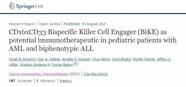 2021年8月,Reusing S B等在知名學(xué)術(shù)期刊《Cancer Immunology, Immunotherapy》上發(fā)表了他們關(guān)于CD16XCD33雙抗的研究報道【3】。
