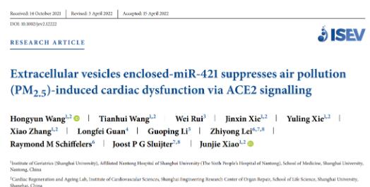 ☛ 上海大學(xué)肖俊杰課題組在《Journal of extracellular vesicles》發(fā)表文章,題目為《Extracellular vesiclesenclosed-miR-421 suppresses air pollution (PM2.5)-induced cardiac dysfunction via ACE2 signalling》