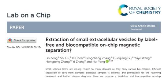 ☛ 中國科學(xué)院深圳技術(shù)研究院楊慧課題組發(fā)表在《Lab on a Chip》發(fā)表文章,題目為《Extraction of small extracellular vesicles by label-free and biocompatible on-chip magnetic separation》