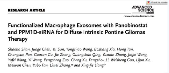 ☛ 北京天壇醫(yī)院張力偉課題組、國家納米科學(xué)中心梁興杰課題組、北京航空航天大學(xué)陳軍歌課題組在《Advanced Science》發(fā)表文章,題目為《Functionalized Macrophage Exosomes with Panobinostat and PPM1D-siRNA for Diffuse Intrinsic Pontine Gliomas Therapy》
