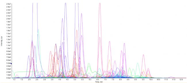 采用高靈敏質譜儀AB SCIEX6500+/7500,檢測下線低至pg級