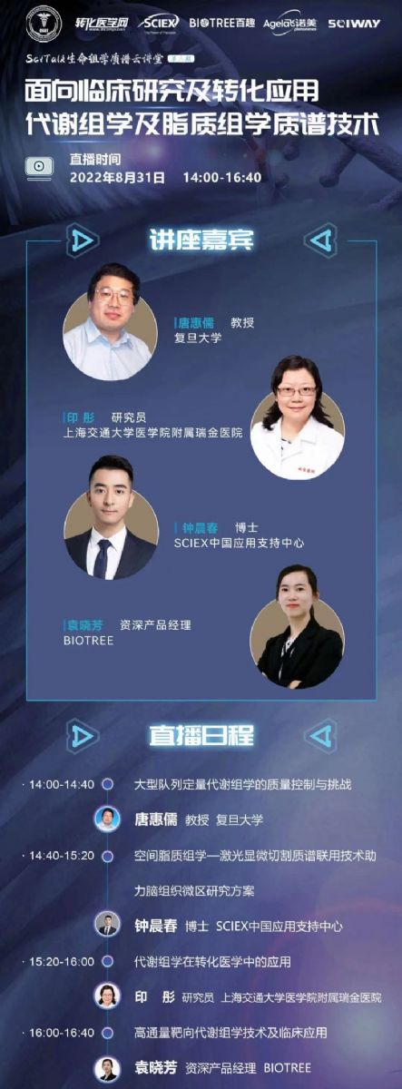 第三期面向臨床研究及轉(zhuǎn)化應(yīng)用-代謝組學(xué)及脂質(zhì)組學(xué)質(zhì)譜技術(shù)研討會將在2022年8月31日舉行,百趣生物代謝組學(xué)資深產(chǎn)品經(jīng)理袁曉芳受邀參加該研討會,講述高通量靶向代謝組學(xué)技術(shù)及臨床應(yīng)用。