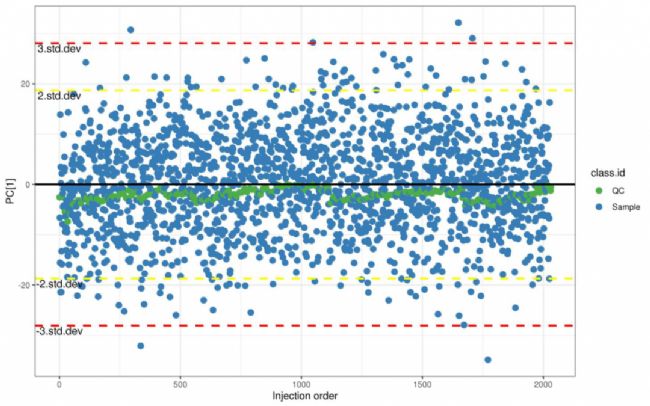 與二維PCA得分圖一樣,圖中每個點代表一個樣本,X軸代表了進(jìn)樣順序,通常所有QC樣本應(yīng)該在2STD以內(nèi)圍繞X軸上下波動。當(dāng)項目樣本量過大時,由于儀器波動會出現(xiàn)一定的偏移。這種時候可以對結(jié)果進(jìn)行一定的矯正。