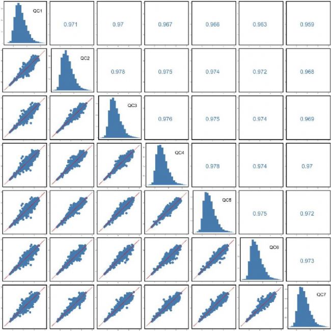 PCA得分圖更多是以圖中樣本位置來判斷數(shù)據(jù)的質(zhì)量,而QC樣本相關(guān)性則是通過樣本中測到的數(shù)據(jù)進(jìn)一步判斷數(shù)據(jù)質(zhì)量。既然QC樣本是技術(shù)重復(fù),那QC樣本間的差異應(yīng)該是很小的,我們對QC樣本中測到所有物質(zhì)在一起計算相關(guān)性,這個相關(guān)性值越接近1越好。