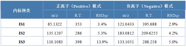 IS:Internal standard(內(nèi)標(biāo)),是在實驗樣本中額外添加的一個或幾個已知物質(zhì)。在非靶標(biāo)代謝組學(xué)中,由于并不知道會測到什么物質(zhì),因此需要在樣本中添加一定的已知物,通過對該已知物檢測結(jié)果的分析進(jìn)而判斷整個實驗檢測的穩(wěn)定性。因此IS需要滿足以下幾個特征: