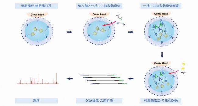 首先ConA beads(Concanavalin A-coated magnetic beads)與細(xì)胞膜或核膜相結(jié)合,隨后通過(guò)穿孔劑對(duì)細(xì)胞進(jìn)行穿孔處理,改變其通透性,依次加入和靶蛋白相對(duì)應(yīng)的一抗、二抗和pA-Tn5 Transposase進(jìn)行孵育,再通過(guò)Mg2+激活Tn5酶,Tn5酶在激活的狀態(tài)下會(huì)定向切割靶蛋白對(duì)應(yīng)的DNA片段,同時(shí)在切割的DNA兩端加上文庫(kù)擴(kuò)增的序列接頭,以便于直接對(duì)回收的DNA片段進(jìn)行PCR建庫(kù)。隨后文庫(kù)質(zhì)量檢測(cè)合格后,便可直接上機(jī)測(cè)序。