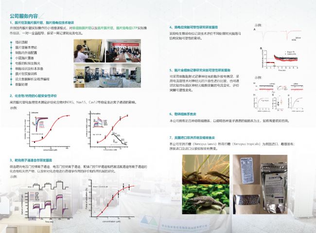 除提供膜片鉗培訓外,公司還可提供化合物/藥物的心臟安全性評價,靶向離子通道合作研發(fā),場電位突觸可塑性研究研發(fā)等其它服務項目,詳見以下: