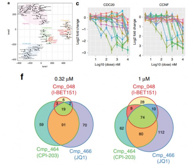 高通量篩選是藥物發(fā)現(xiàn)的主要手段,很多都是基于靶標(biāo)和表型的篩選,例如RNA-seq,但通量低,需要開發(fā)一種通量更高且成本更低的方法,可以在多個(gè)實(shí)驗(yàn)條件下篩選大量化合物。該研究用433種具有靶標(biāo)藥物性質(zhì)的化合物處理骨肉瘤U2OS細(xì)胞,88個(gè)被鑒定為有效化合物(>50個(gè)基因顯著改變)。聚類分析得出,同一簇中不同化合物的藥理作用機(jī)制(MoA)相同,進(jìn)而可以推測出同一簇其他靶標(biāo)化合物的MoA(圖A)。在被干擾細(xì)胞周期的藥物處理后,CDC20和CCNF(參與細(xì)胞周期功能)被下調(diào)(圖C)。不同濃度藥物處理下的細(xì)胞基因表達(dá)具有差異(圖F)。該研究僅為藥物處理后某一時(shí)間點(diǎn)的轉(zhuǎn)錄情況,AccuraCell™單細(xì)胞動(dòng)態(tài)轉(zhuǎn)錄組測序可在其基礎(chǔ)上添加時(shí)間維度,研究藥物處理一段時(shí)間內(nèi)的轉(zhuǎn)錄動(dòng)態(tài)變化,從新生RNA角度更能體現(xiàn)藥物引起的直接轉(zhuǎn)錄變化,深層次解析藥物響應(yīng)機(jī)制。