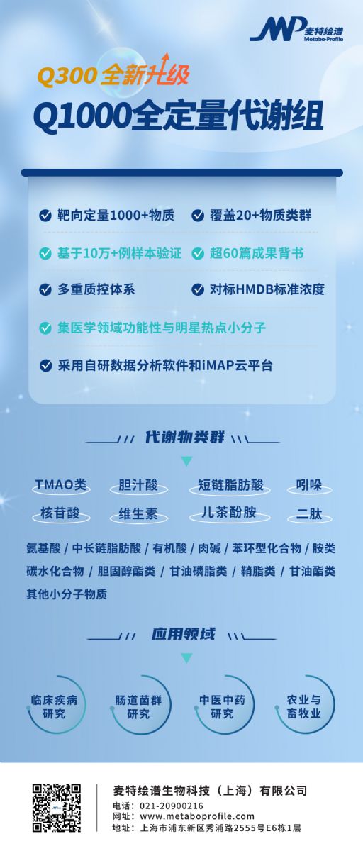 2023新年伊始,繪譜研發(fā)團(tuán)隊歷經(jīng)調(diào)研、篩選、整合、驗證等階段性技術(shù)攻關(guān),建立了穩(wěn)定、準(zhǔn)確、可靠的方法體系,研發(fā)出Q300重磅升級新品——“Q1000全定量代謝組”正式上市(時間2023年2月),基于UPLC-MS/MS平臺的Q1000可同時高通量靶向定量檢測1000+種代謝物,超強(qiáng)覆蓋TMAO類、短鏈脂肪酸、膽汁酸、吲哚、中長鏈脂肪酸、核苷酸、有機(jī)酸、氨基酸、二肽、胺類、碳水化合物等二十余種小分子代謝物類群及脂質(zhì),完美兼顧非靶向廣覆蓋和靶向定量準(zhǔn)的優(yōu)勢,將全面滿足廣大科研用戶的檢測需求。