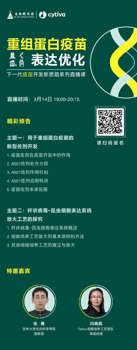 Cytiva與生物制品圈聯(lián)合舉辦的【下一代疫苗開(kāi)發(fā)新思路】系列直播課程將再度聚焦重組疫苗的技術(shù)進(jìn)展,第二期將為大家?guī)?lái)《重組蛋白疫苗表達(dá)優(yōu)化》相關(guān)話(huà)題。同時(shí)邀請(qǐng)到了吉林大學(xué)張勇教授分享AS01佐劑在重組蛋白疫苗中的應(yīng)用剖析,并有Cytiva的技術(shù)專(zhuān)家閆曉凱博士深入介紹桿狀病毒-昆蟲(chóng)細(xì)胞表達(dá)系統(tǒng)放大工藝的探究。3月14日晚19:00,快來(lái)報(bào)名預(yù)約吧。