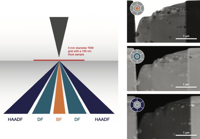 明場(BF)、暗場(DF)和高角度環(huán)形暗場(HAADF)成像示意圖和成像對比圖